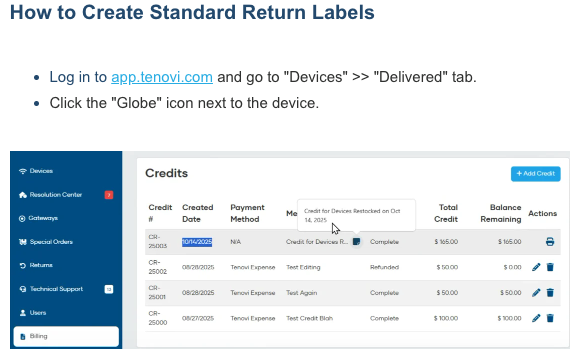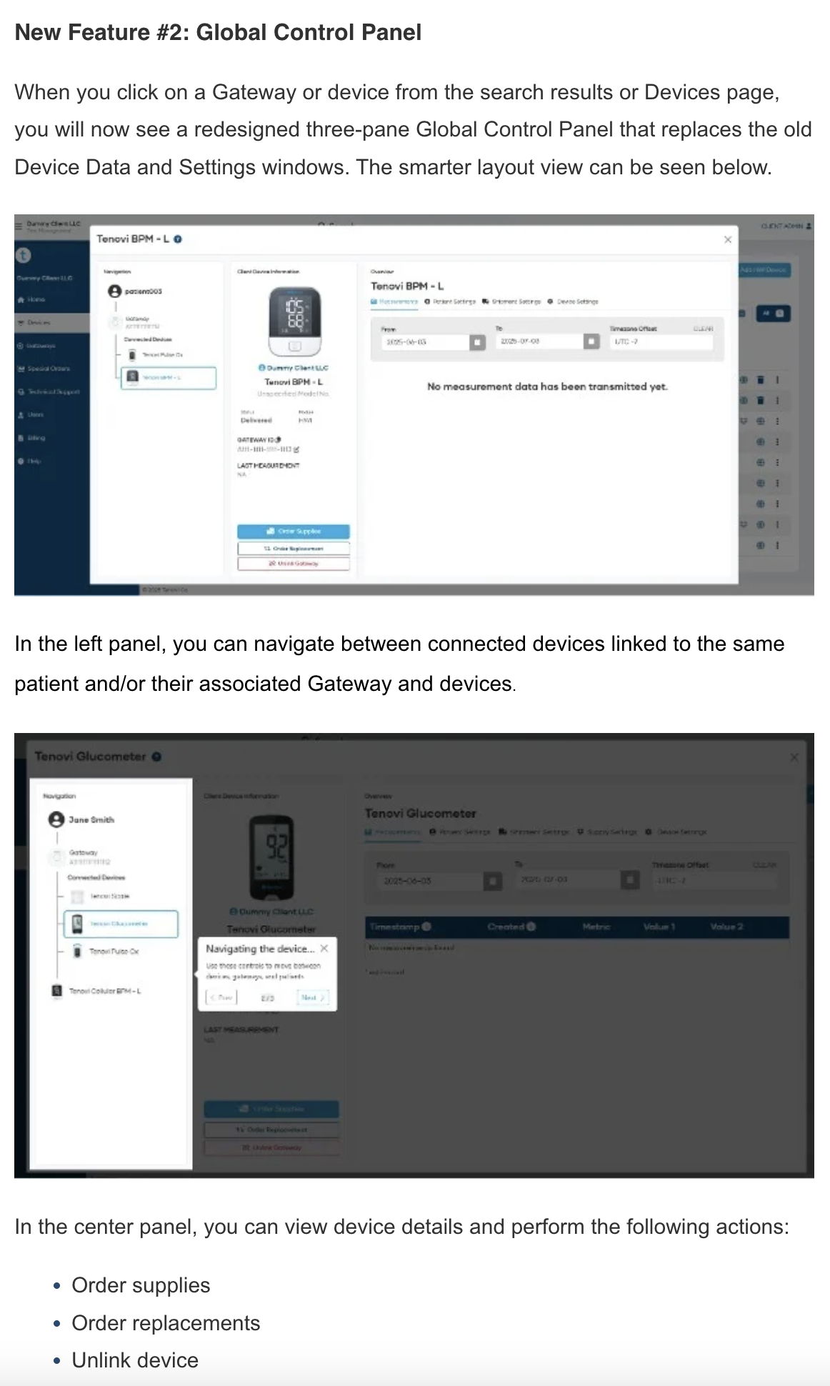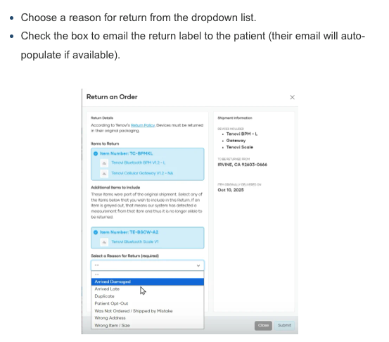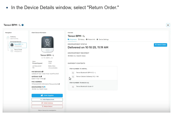 - Ordering supplies via app.tenovi.com must now be performed via the Devices dashboard. To order supplies, simply search for the relevant Device, then select “Order Supplies” from the context menu. This will ensure all supplies are properly validated and associated with the correct patient.