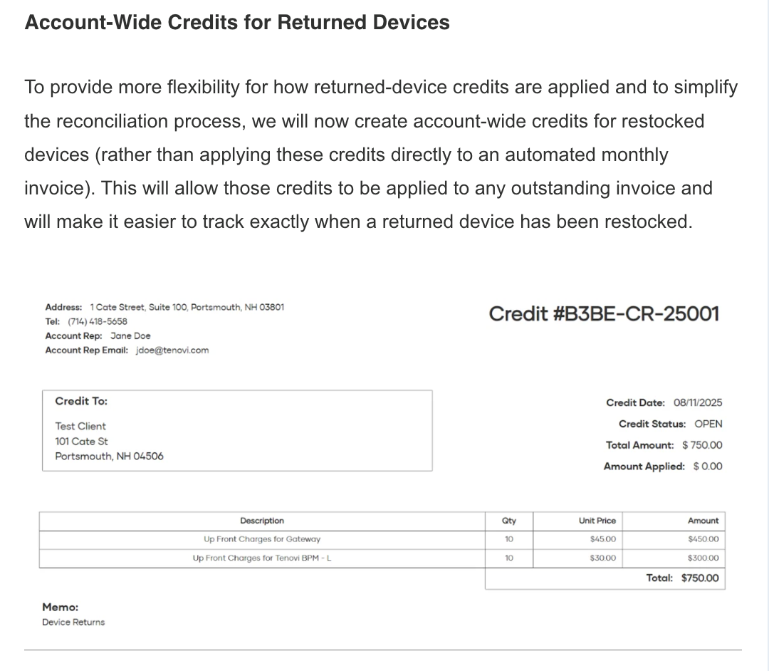 - As part of an ongoing effort to standardize our system across all our customers, some clients may notice minor changes to the Device names listed in various places on app.tenovi.com (e.g. when ordering new Devices or viewing Invoices). For example, the “Tenovi BPM” naming convention will be standardized to “Tenovi BPM – L”. Orders being placed via API can continue to use the existing naming conventions without disruption, though we recommend clients make plans to harmonize their naming conventions with our new standards.