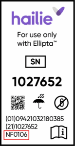 - The Client/Care Manager will need to select the correct model number for the corresponding Hailie Sensor when adding the device to the RPM software. (i.e. NF0106 = Ellipta). The model number can be found on the bottom label of the Hailie Sensor (See Image 1).