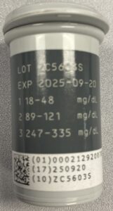 - Next, check the test strip bottle for the expected range for your control solution. This is not located on the control solution bottle but on the container that holds your test strips.