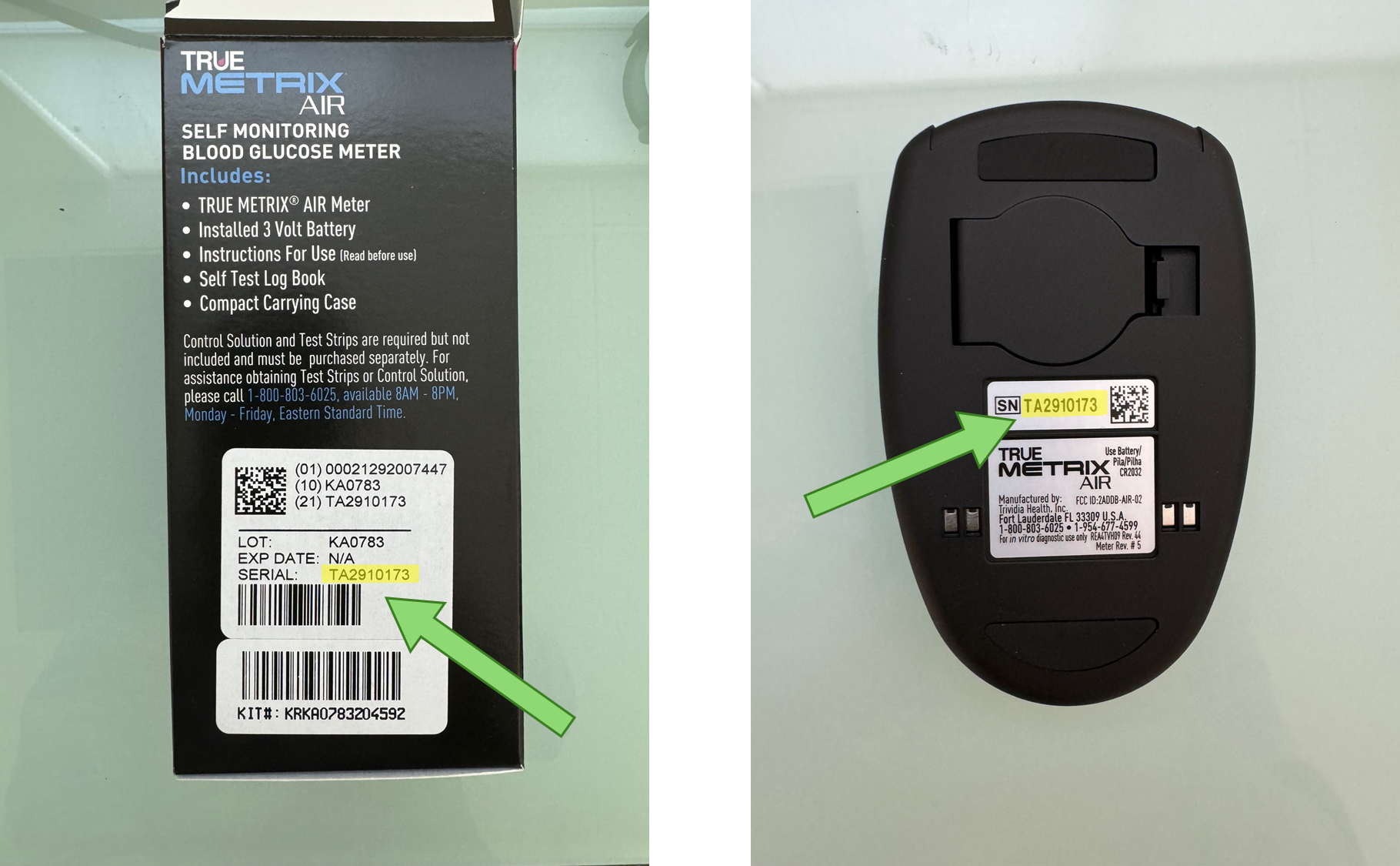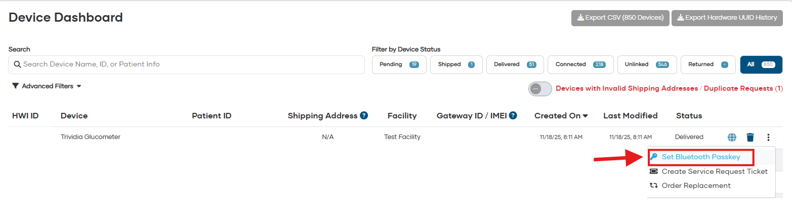 - After adding the Trividia Glucometer device type, you can enter the Serial Number as the Bluetooth passkey on the Device Dashboard. Only the numbers need to be entered; exclude the letters at the beginning of the Serial Number. (See Image 1 and Image 2 below)